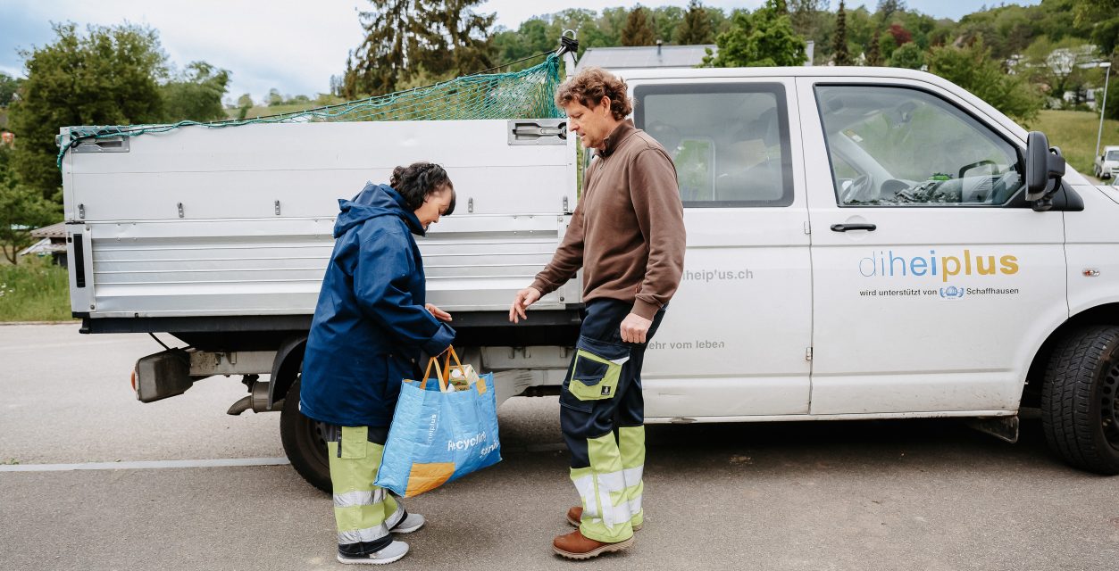 Sie sammeln – die Klient/innen des Recylingteams machen den Rest: der Abholdienst sammelt ein – im Recyclingcenter wird sortiert, gereinigt, gepresst und entsorgt.